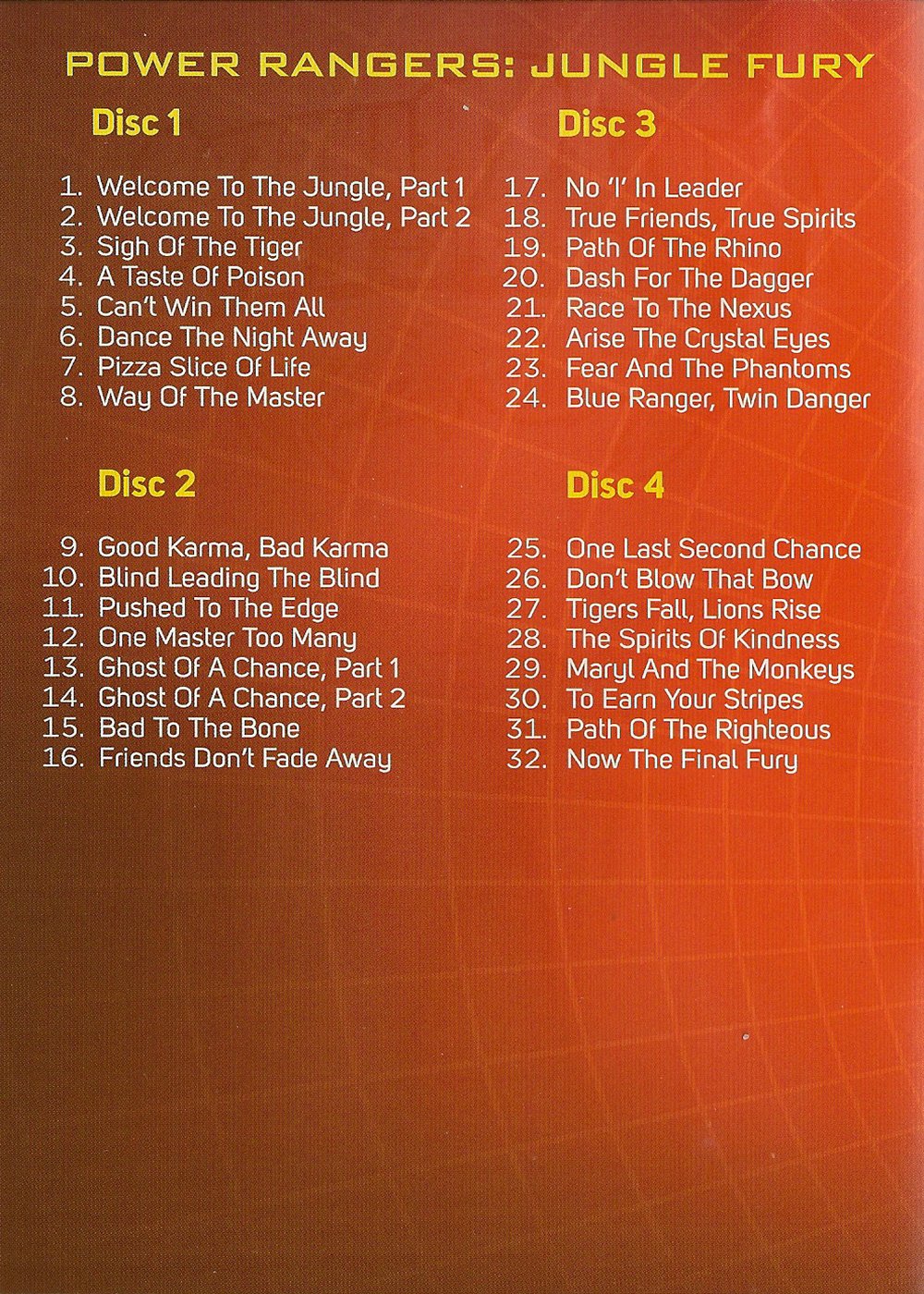 UPC: 786936786484 DESCRIPTION: In the latest iteration of the Power Rangers story, three skilled members of the Kung Fu clan Pai Zhuq, or Order of the Claw, are selected to fight the villainous Dai Shi. The warriors are given the special gift of becoming the Jungle Fury Power Rangers and are the earth s only hope to stop an army of evil animal spirits from overtaking the world. Throughout their journey, the Rangers are joined by other highly trained members of the Kung Fu clan to teach them important lessons and help them in their battle. END